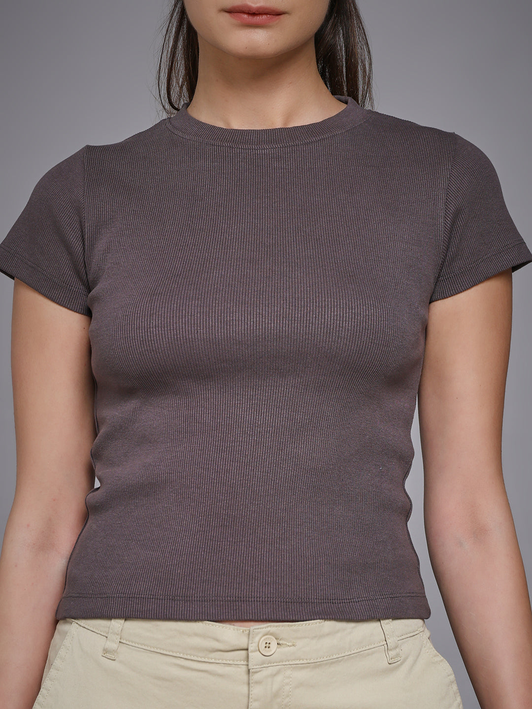 MKH Dark Grey Solid Maroon Body-Hug Ribbed Tee
