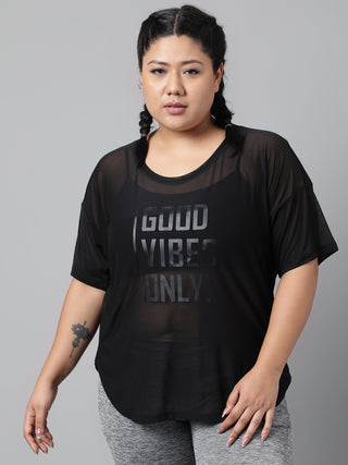MKH Plus Size Black Mesh Activewear T-Shirt for Women
